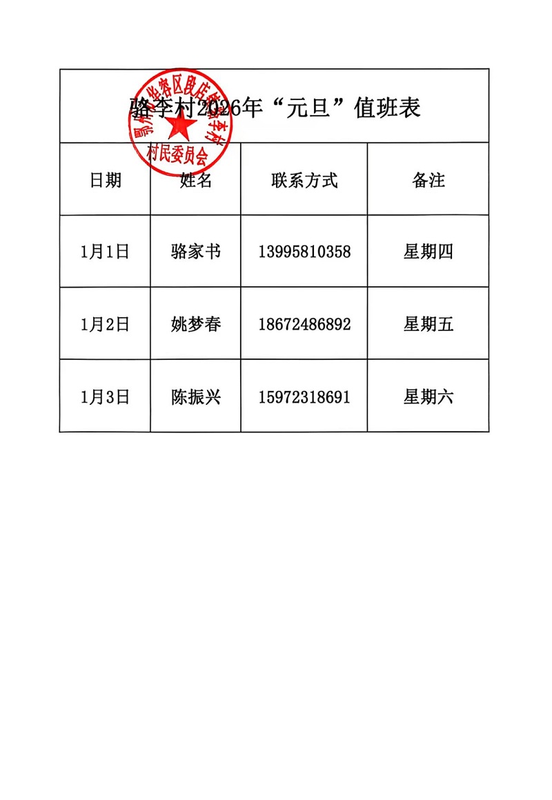 元旦值班表