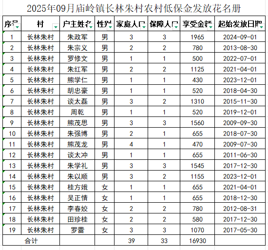 2025年09月庙岭镇长林朱村农村低保金发放花名册