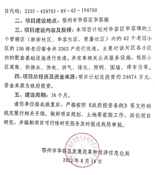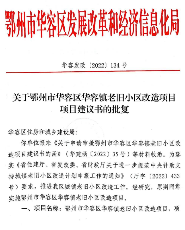【华容区华容镇老旧小区改造项目】关于鄂州市华容区华容镇老旧小区改造项目建议书的批复