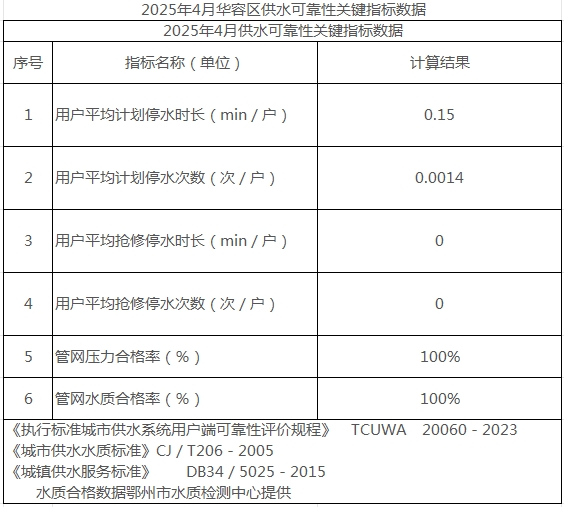 2025年4月华容区供水可靠性关键指标数据