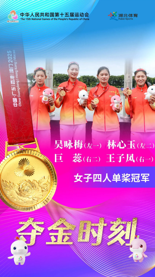 在随后进行的女子四人单桨决赛中,由吴咏梅、林心玉、巨蕊、王子凤组成的湖北女队闪亮登场。她们先声夺人,稳稳占据领先位置。四位巾帼英雄桨频稳定、力量十足,船桨在水中划出优美的弧线,全程保持领先的她们,最终以4分49秒76的优异成绩,为湖北代表团再添一枚宝贵的金牌!
