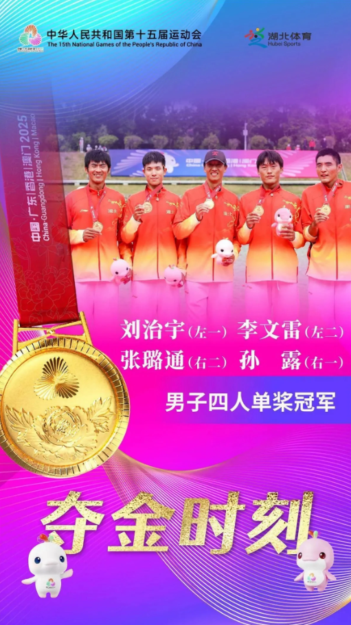 比赛当天,湖北队展现出强大实力。上午进行的男子四人单桨决赛,湖北队派出李文雷、张璐通、刘治宇、孙露四人强强联手。他们桨频同步、动作利落,赛艇似利剑般劈波斩浪,最终以4分20秒67的绝对优势率先冲过终点,成功摘得桂冠!这枚金牌不仅是湖北赛艇队的全运会开门红,更是湖北体育代表团在竞技项目上的第五金!