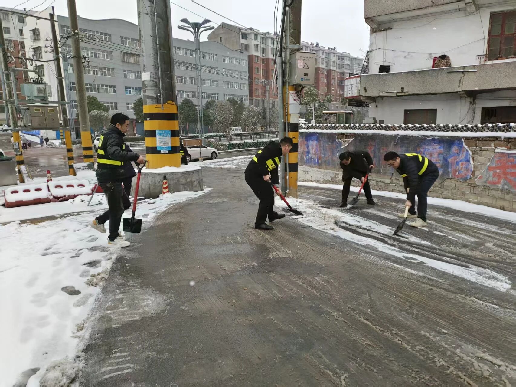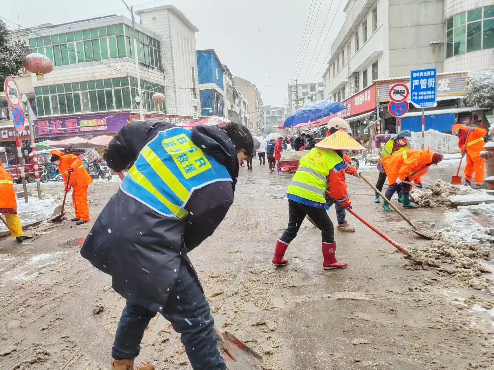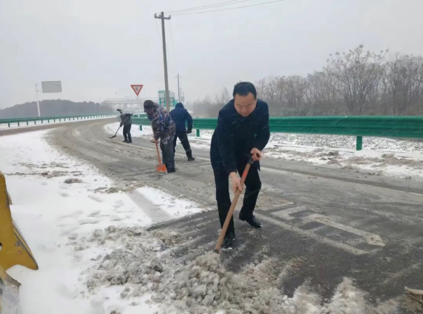 段店镇镇村干部群众拿着铁锹、扫帚奔赴316国道段店段及县道中咀路、华泥路等路段,铲冰除雪、铺设防滑设施,确保乡村道路畅通。