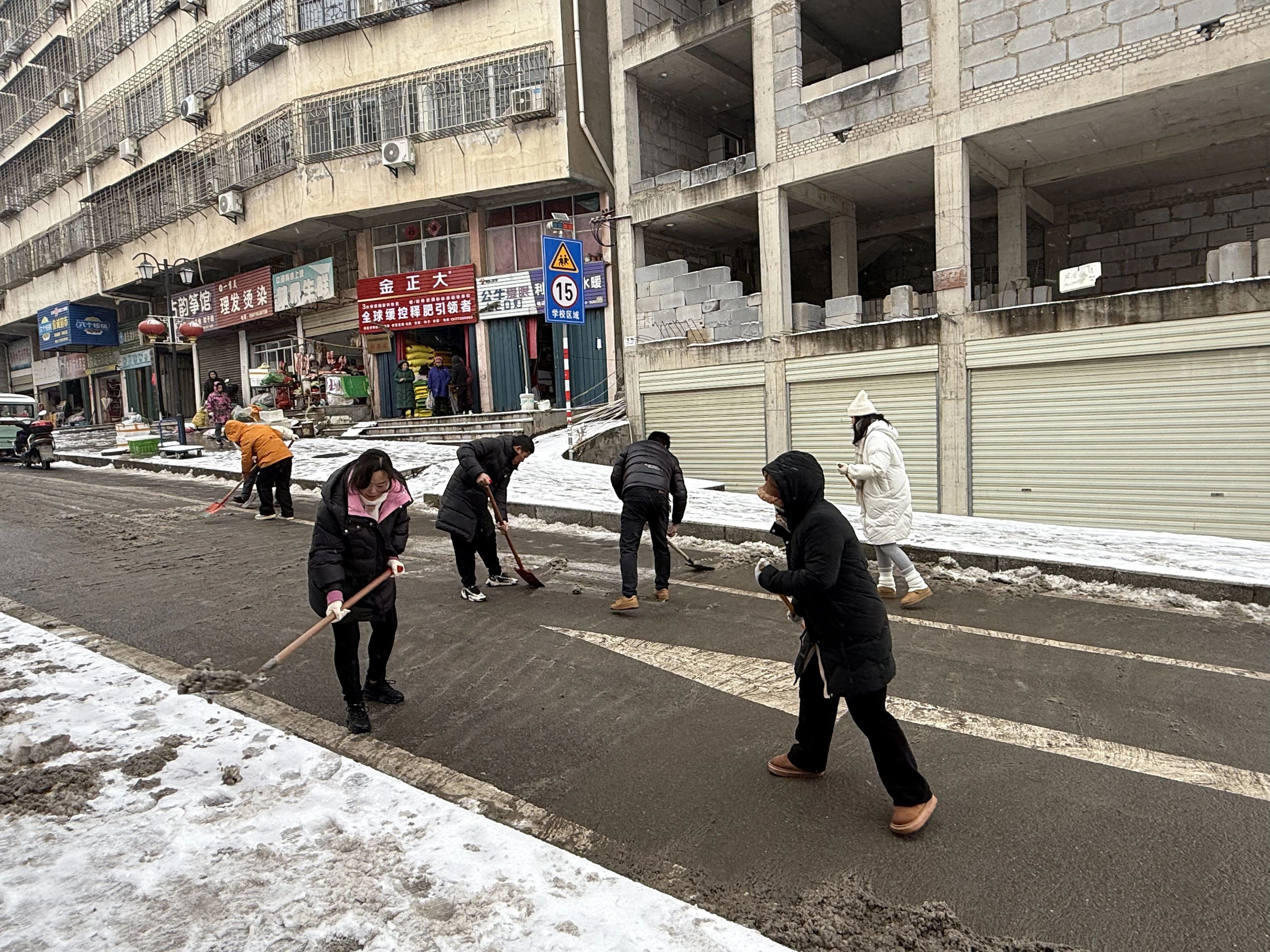 雪情发生后,华容区教育局迅速部署,各校同步启动应急预案。老师们走出教室,手持工具清扫校园道路、校门口坡道的积雪,细心铺设防滑草垫。