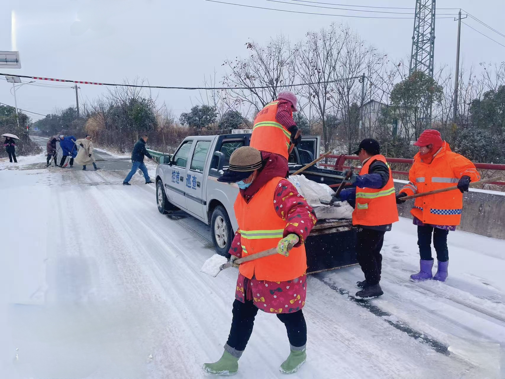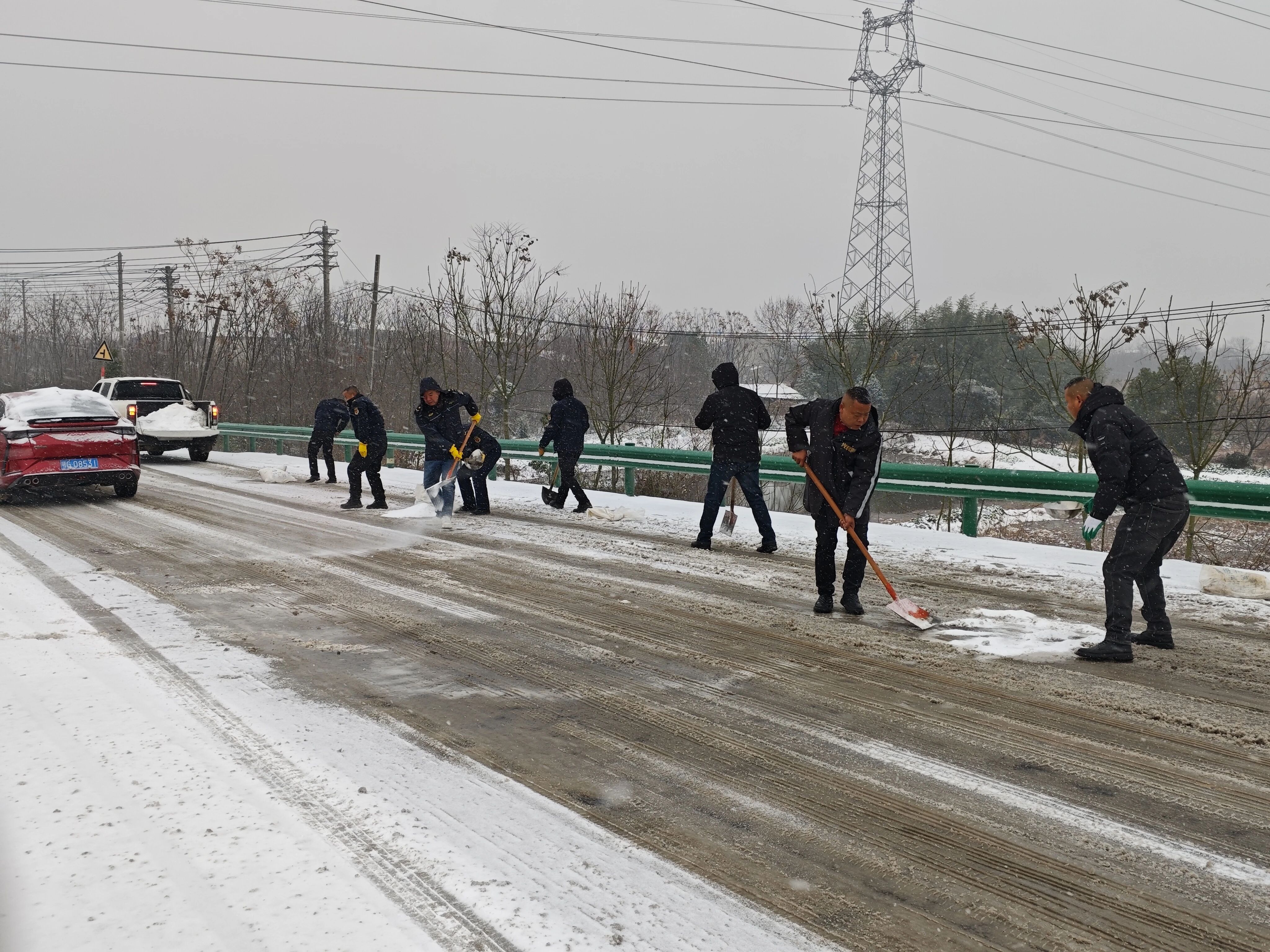 蒲团乡党员干部、志愿者与群众组队出击,调动1台撒盐车、3台铲车及30把铁锹、1台油锯等装备,重点对樊寺线小港至郭垱、横瓜线、吉蔡线等23公里县乡村道路,以及鄂咸高速小港天桥、小庙汉鄂高速天桥等易结冰点位,开展铲冰除雪、撒布融雪剂作业,全力扫清出行障碍。