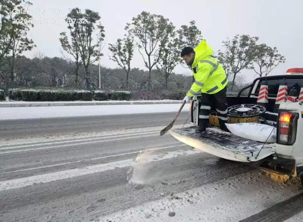 公安、交警、交通、城管等部门各司其职,武鄂高速华蒲出口、武黄高速庙岭出口等交通枢纽,工作人员在高速进出口洒盐除雪。