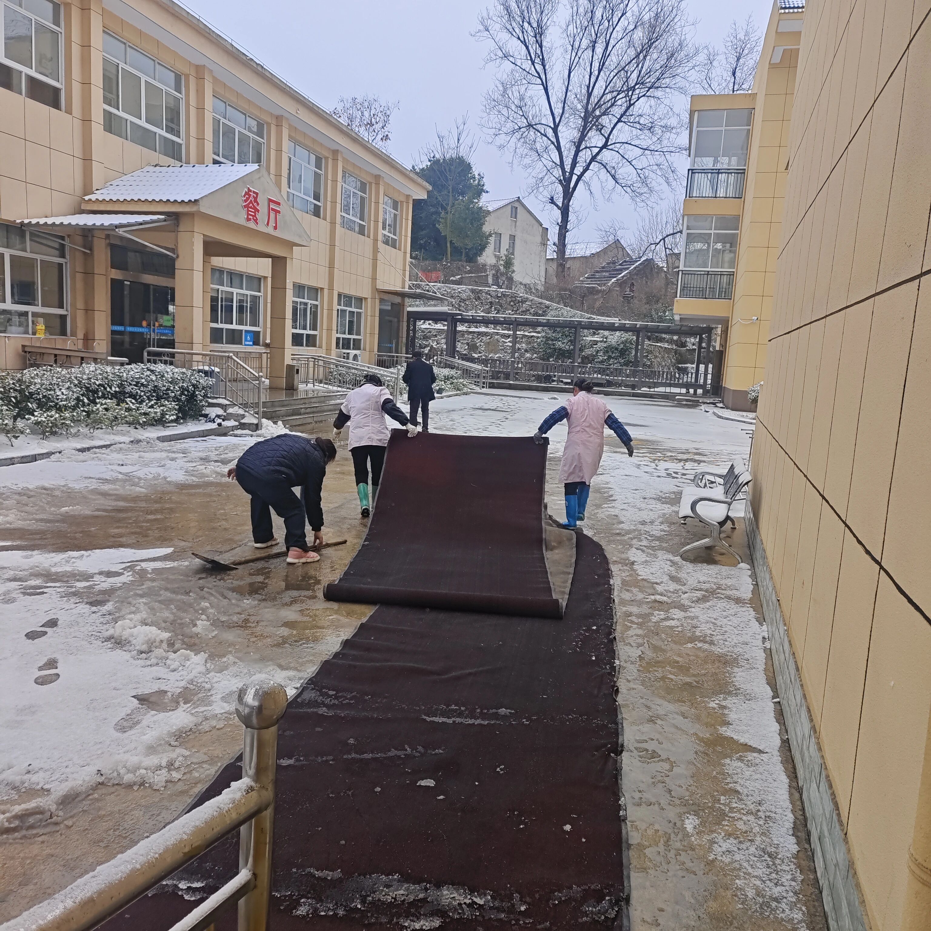 区福利中心内,工作人员铲除院内积雪,并在走廊、坡道、活动区域等重点位置铺设防滑垫,全面排查设施安全隐患,用贴心举措筑起“脚下安全防线”。