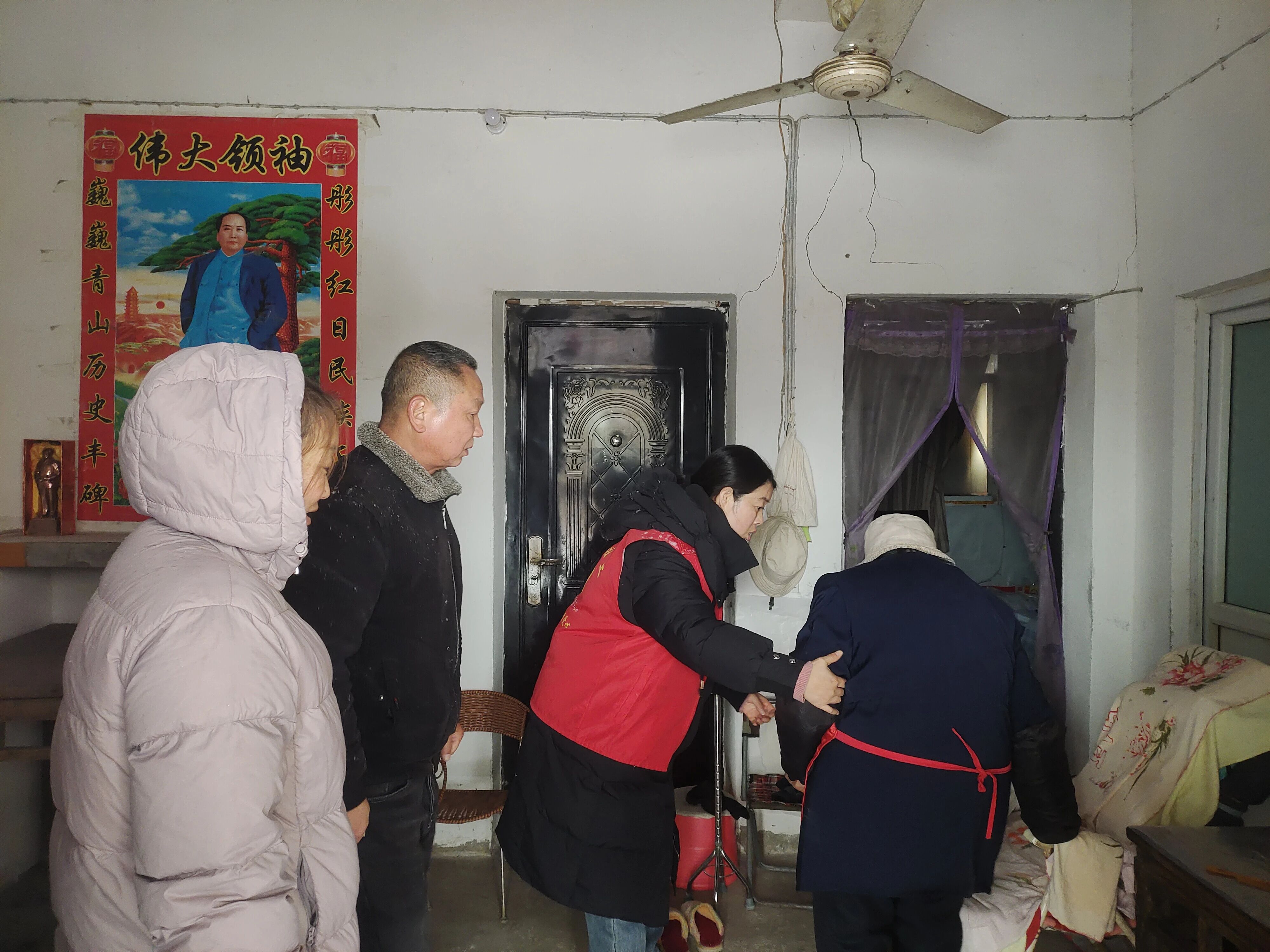 庙岭镇镇村干部、网格员顶风冒雪,穿梭在乡村巷道间,挨家挨户走访辖区重点人员,不仅耐心转告雨雪天气下交通出行的安全注意事项,细致排查用电用气隐患,还贴心提醒做好降温保暖措施,让寒冷冬日里的守护不留死角。
